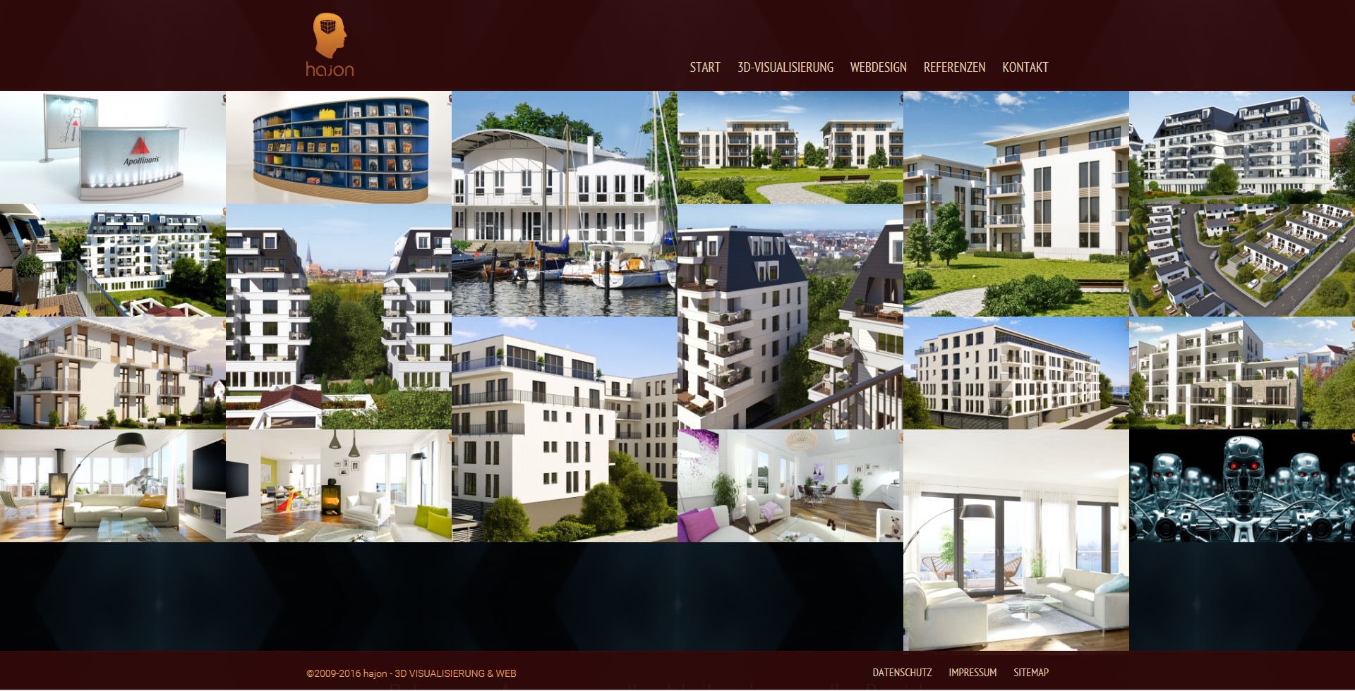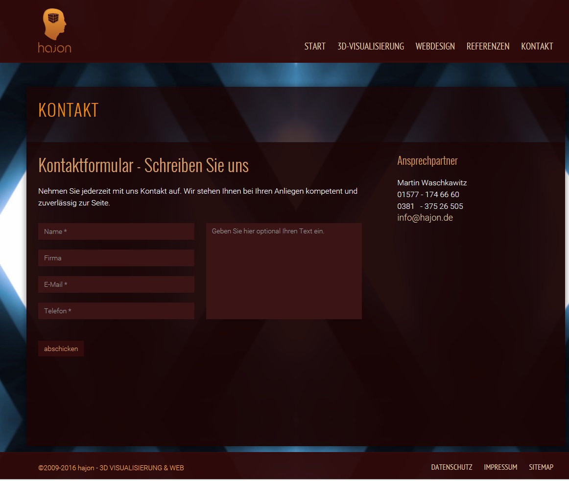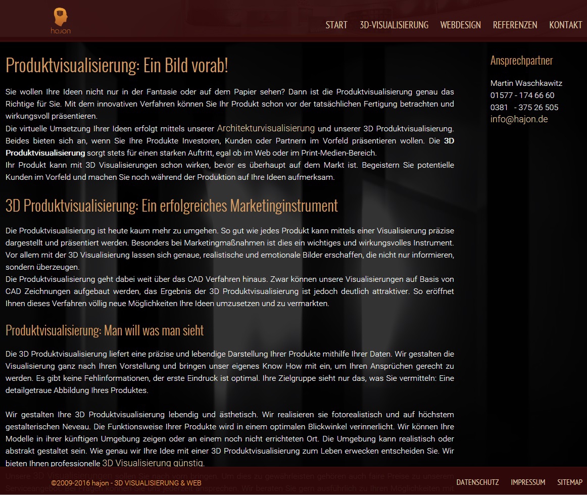 Seit 2009 steht die Firma hajon von Martin Waschkawitz für hochqualitative 3D Visualisierungen, 3D Animationen, Logodesign, Bildbearbeitung, Fotografie und Webdesign. Mit professioneller Software wie 3D Studio Max, Photoshop, ZBrush und leistungsstarker Hardware stellt hajon seit Jahren zuverlässig seine Kunden zufrieden. Ob im Bereich Exterieur-, Interieur, Architektur- oder Produktvisualisierung, jedes neue Projekt hat für sich eine herausragende Qualität. Realität oder Fiktion sind oft nur schwer zu unterscheiden. Durch sein hohes Maß an Kreativität hat jedes einzelne Projekt seinen eigenen Charme.